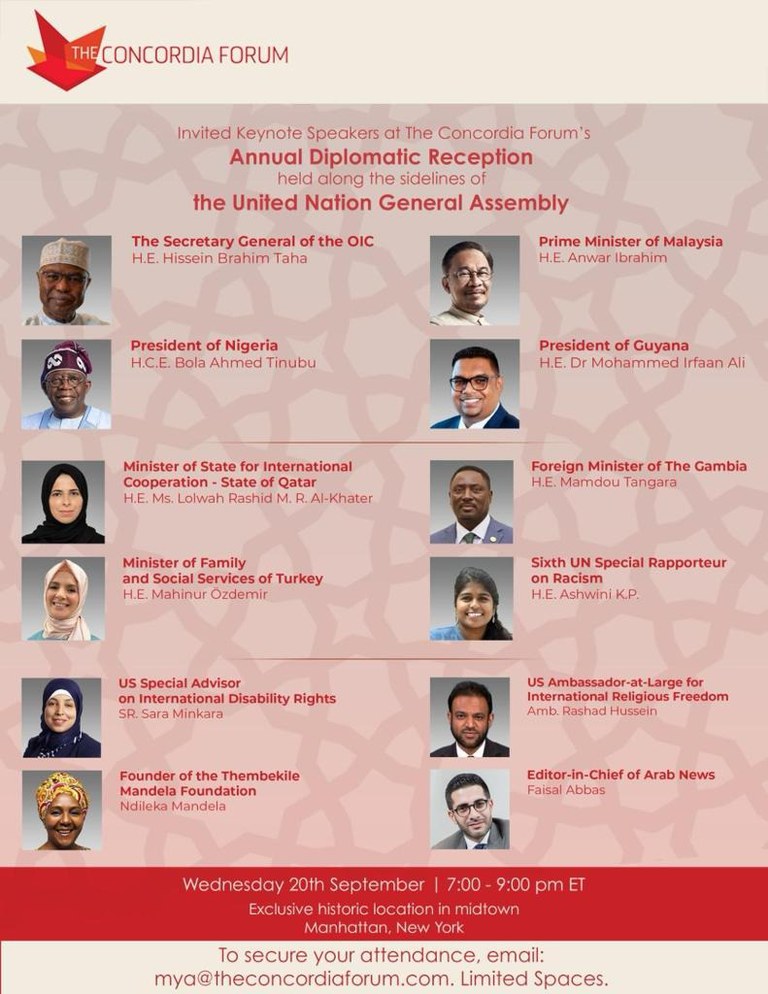 Ayrıca, 78. BM Genel Kurul Toplantısı New York'ta yapılırken, Amerika Birleşik Devletleri'ndeki Uygur Araştırma Merkezi Başkanı Abdulhakim İdris, 20 Eylül'de dünyanın dört bir yanındaki Müslüman elitlerin ve diplomatların yıllık toplantısı olan "Concordia Forumu"na katıldı. Abdulhakim İdris toplantı ile ilgili şunları söyledi: Baskı ve tepki hakkında konuştum. Görüşmeler sırasında bazı Afrika ülkelerinden diplomatlar, Uygurların kurduğu iki milletli Doğu Türkistan Cumhuriyeti ile ilgili bu bilgilerin önemli olduğunu ve birçok ülkenin Uygurların aslen bağımsız olduğunu bilmediğini söyledi.
