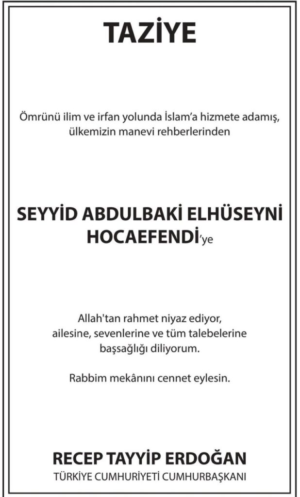 Cumhurbaşkanı Recep Tayyip Erdoğan, vefat eden Abdülbaki Elhüseyni Hocaefendi için gazetelere taziye ilanı verdi.