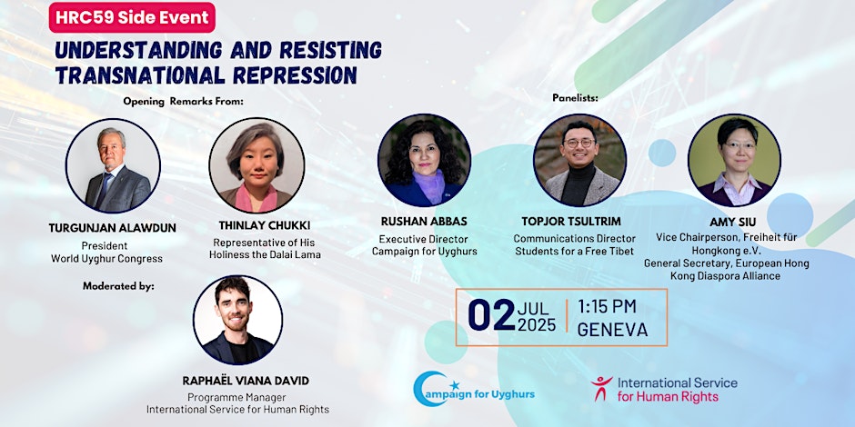 Uygur Hareketi(CFU) ve International Service for Human Rights (ISHR) tarafından düzenlenen bu etkinlik, Cenevre’deki İnsan Hakları Konseyi’nin 59. oturumuyla birlikte gerçekleştirilecektir. Yaşanmış deneyimlerden ve uzman görüşlerinden yararlanarak, tartışma ulusötesi baskının artan kullanımını ortaya koyacak ve insan haklarını savunanları korumak için BM ve hükümetler için somut öneriler sunacaktır.