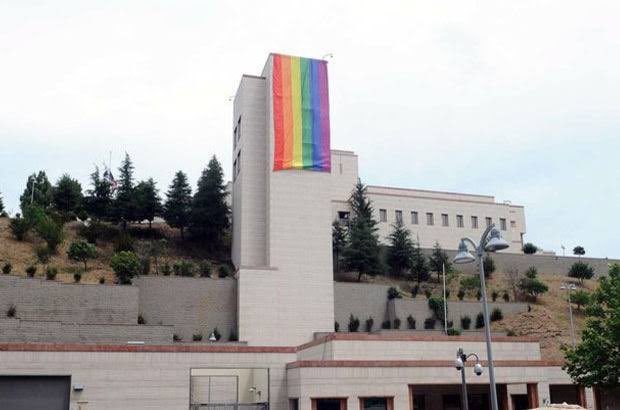 ABD'nin İstanbul'daki konsolosluk binasına dev bir ibneleri temsil ettiği iddia edilen sözde paçavra asıldı.