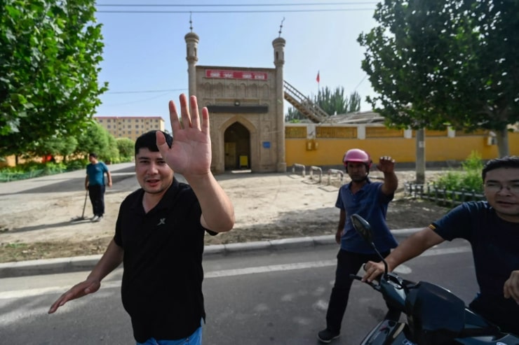 18 Temmuz 2023'te çekilen bu fotoğraf, Doğu Türkistan’ın Yarkant'ın dışında, Azatbağ köyündeki bir caminin dışında fotoğraf çekilmesini engellemeye çalışan yerel halkı gösteriyor Pedro PARDO / AFP