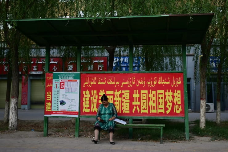 Doğu Türkistan'ın Yarkant kentinde bir kadın, Çin hükümetinin sloganını taşıyan bir otobüs durağında oturuyor © Pedro PARDO / AFP
