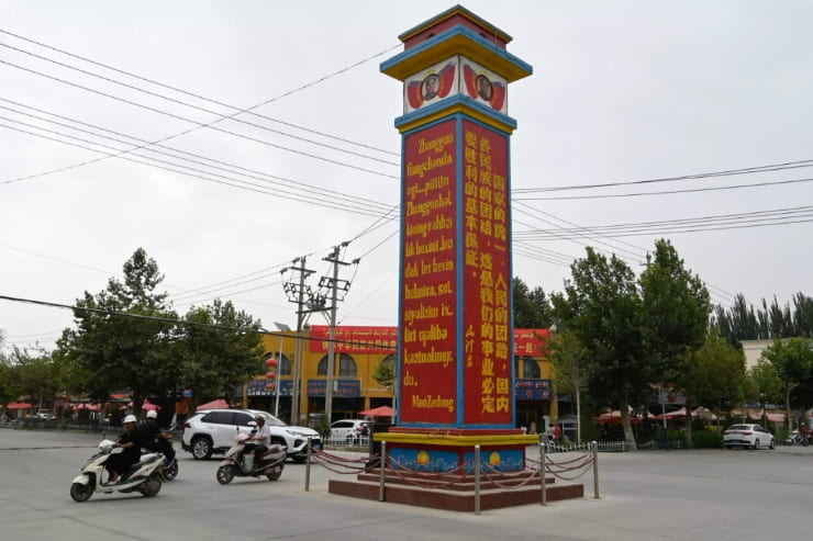 Doğu Türkistan Yarkant dışındaki yolda "On İki Sosyalist Temel Değer" taşıyan siyasi propaganda görülüyor © Pedro PARDO / AFP