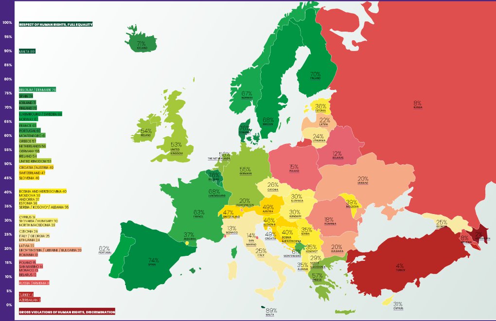 2009 yılından bu yana her yıl yayınlanan ILGA Avrupa Gökkuşağı Haritası'nın son sayısında Azerbaycan ve Türkiye sondan bir ve ikinci oldu.