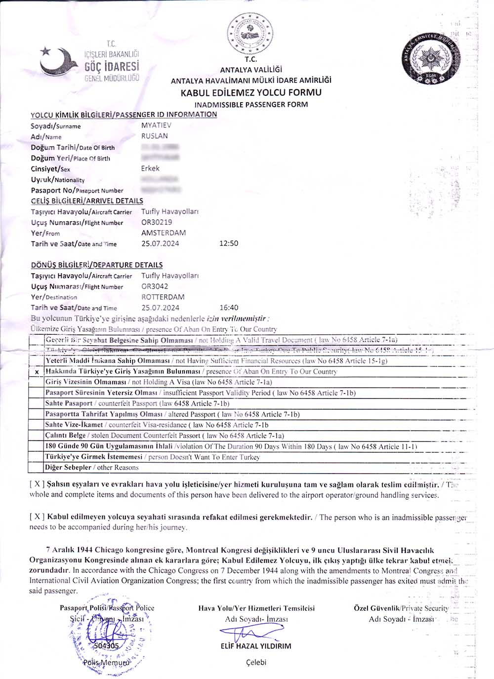 Myatiev, ailesiyle birlikte tatil için Antalya havaalanına vardığında, polis ona ülkeye giriş yasağı uygulandığını bildirdi. Myatiev, CPJ’ye resmi olarak kendisine daha fazla bilgi verilmediğini, ancak kolluk kuvvetlerinin yasağın “devlet güvenliğine karşı faaliyet” ile ilgili olan G-82 kodu altında sınıflandırıldığını ve Türkmenistan tarafından talep edildiğini birbirlerine söylediklerini duyduğunu belirtti. Yetkililer, Myatiev’i dört saat boyunca gözaltında tuttu ve kendisine iş ve seyahati hakkında sorular sorduktan sonra onu Hollanda’ya geri gönderdiler.