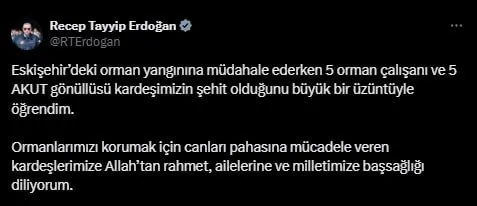 "Eskişehir'deki orman yangınına müdahale ederken 5 orman çalışanı ve 5 AKUT gönüllüsü kardeşimizin şehit olduğunu büyük bir üzüntüyle öğrendim. Ormanlarımızı korumak için canları pahasına mücadele veren kardeşlerimize Allah'tan rahmet, ailelerine ve milletimize başsağlığı diliyorum."
